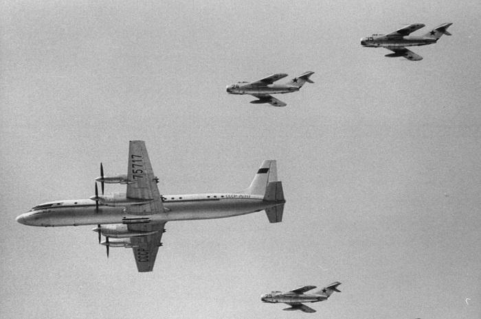 1. 4 самолета сопровождают пассажирский Ил-18 во время перелета Москвы с Юрием Гагариным на борту