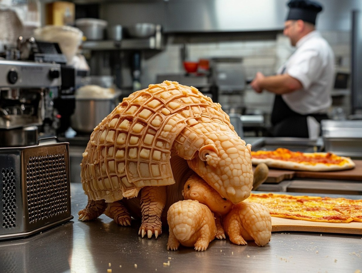 Создано на основе запроса: a brightly lit photograph of an armadillo that looks like cheese huddling with its 3 baby cheese armadillos. They are next to a large cheese grater on a stainless steel counter top of a commercial kitchen that makes pizza. There is a mixer and commercial ovens in the background. There is a chef in the background with a pizza on a wooden pizza paddle. Sony A65 camera. --- Автоперевод: Ярко освещенная фотография броненосца, которая похожа на сыр, сгрудившись с 3 детскими сырами. Как тебе эта картинка? 🤔 https://dzen.ru/id/65c0c65c86e4f837c27b24d7 #ИИ #AI #нейросеть #midjourney #art