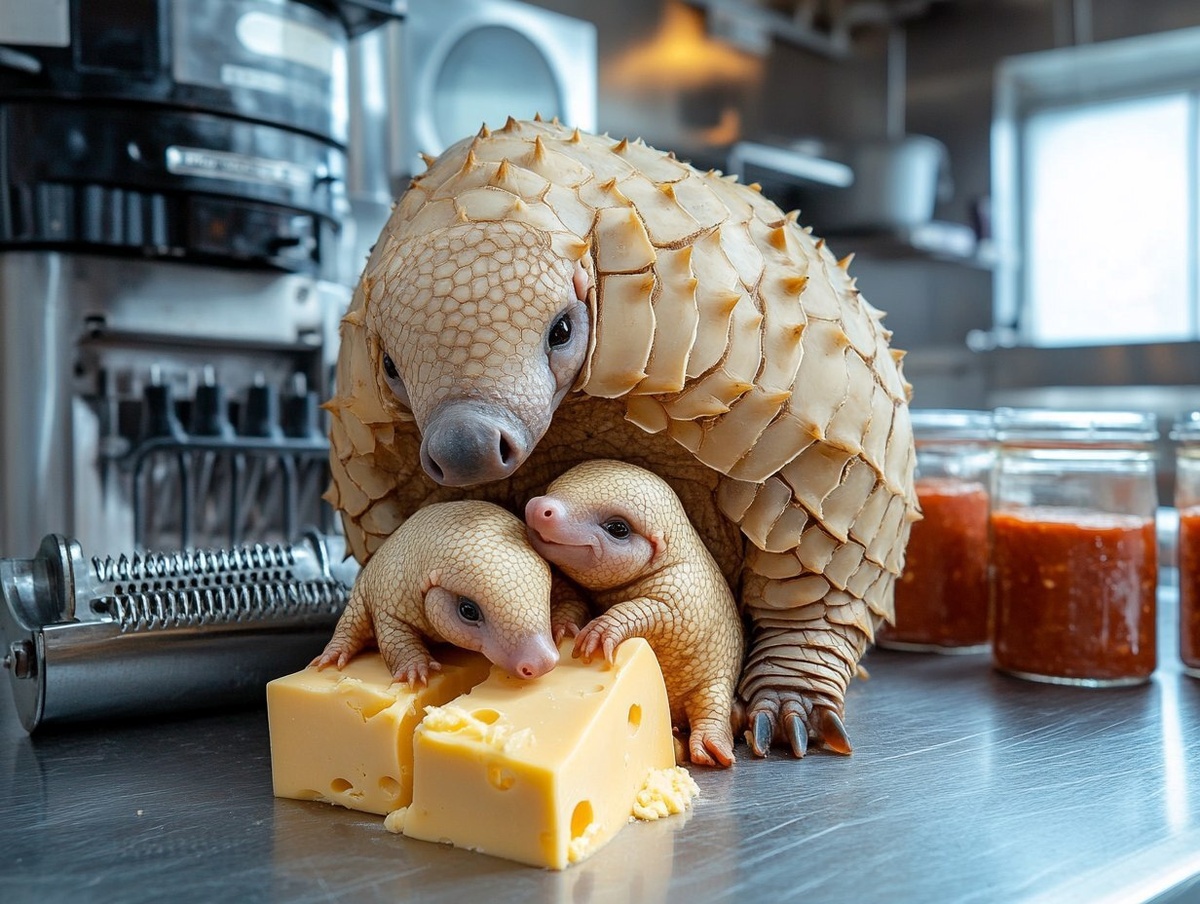 Создано на основе запроса: a brightly lit photograph of an armadillo that looks like cheese huddling with its 3 baby cheese armadillos. The armadillos have a sad look in their eyes. They are next to a large cheese grater on a stainless steel counter top of a commercial kitchen that makes pizza. There is a mixer and large jars of tomato sauce. There are commercial ovens in the background. Sony A65 camera. --- Автоперевод: Ярко освещенная фотография броненосца, которая похожа на сыр, сгрудившись с 3 детскими сырами. Классно выглядит? 🤔 https://dzen.ru/id/65c0c65c86e4f837c27b24d7 #ИИ #AI #нейросеть #midjourney #art