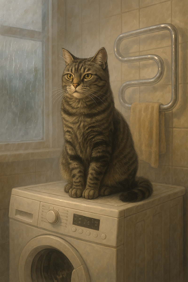 А теперь — история от имени самого Лекса. Потому что в этот дождливый день у него был свой маршрут. И своя миссия. Если вы думаете, что дождь — это просто вода с неба, вы, скорее всего, не кот. А я — кот. Лекс. Мне 13 лет. Я старший в этой стае, бывший домашний сахалинский философ и нынешний приморский патрульный. Когда с утра закапало, я понял: в лес сегодня не пойдёт никто. Особенно я. Пусть торпеды там брызжут своими лапами, мне важнее — стратегия выживания в условиях серости Первая точка маршрута: миска с кормом. Она стоит на морозильной камере в спальне у папы. Высоко, гордо, вне досягаемости корги. Съедено было чинно, не спеша. С чувством, с толком, с душой. Следующая остановка: ванная комната. Там стоит стиральная машина. А над ней — тёплый змеевик. Это не просто змеевик. Это — трон. Я запрыгнул, развалился и погрузился в философские размышления. О чём думает кот в дождливый день? О вечности. О смысле жизни. О том, как хорошо, что я не вышел гулять. А ещё — как бы обойти Лану
