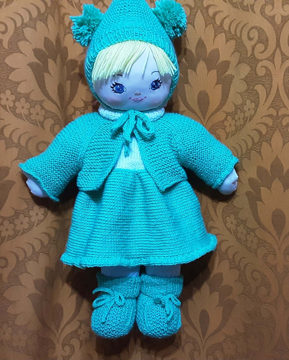Дорогие друзья! Насмотрелась я, как Танечка Кильмяшкина вяжет костюмчики да шапочки своему Басику, и решила навязать разной одёжки для куколки. Взяла пряжу Комтекс Бамбино молочный цвет и мятный. Спицы 4 мм. Связала сначала платьице, потом пинетки, шапочку и кофточку. Получился замечательный комплект.