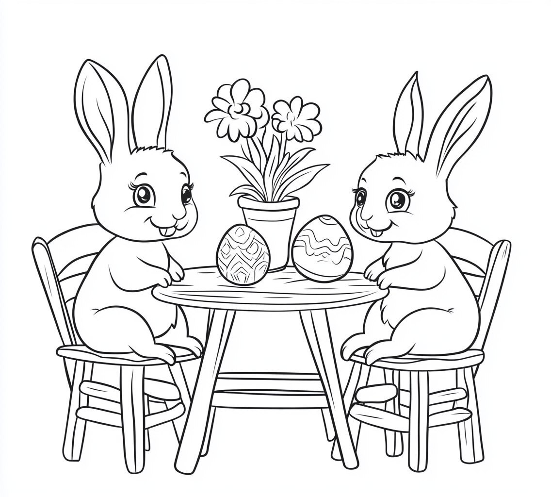 Создано на основе запроса: Coloring page in black and white, cute cartoon style. Two bunnies sitting at a table with Easter eggs in the middle of them, on wooden chairs. Simple shapes for kids to color in, with a white background and no shading or lines around the edges. The two rabbits are sitting side by side, one holding an egg that is colored in, while the other rabbit has its head down, looking sad. There is a table between the rabbits with a flower pot on it.