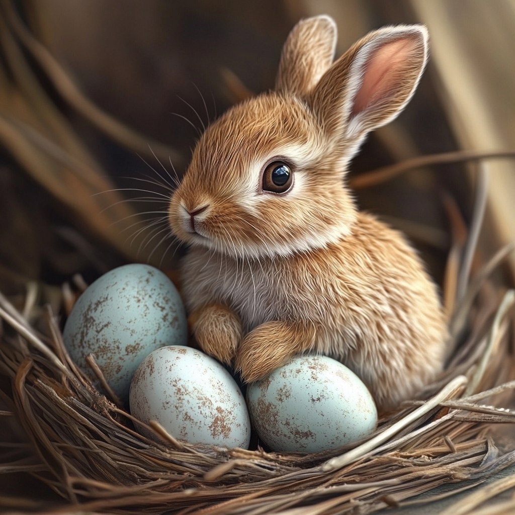 Создано на основе запроса: A small cute rabbit of the eggs painted, 4K, photorealistic