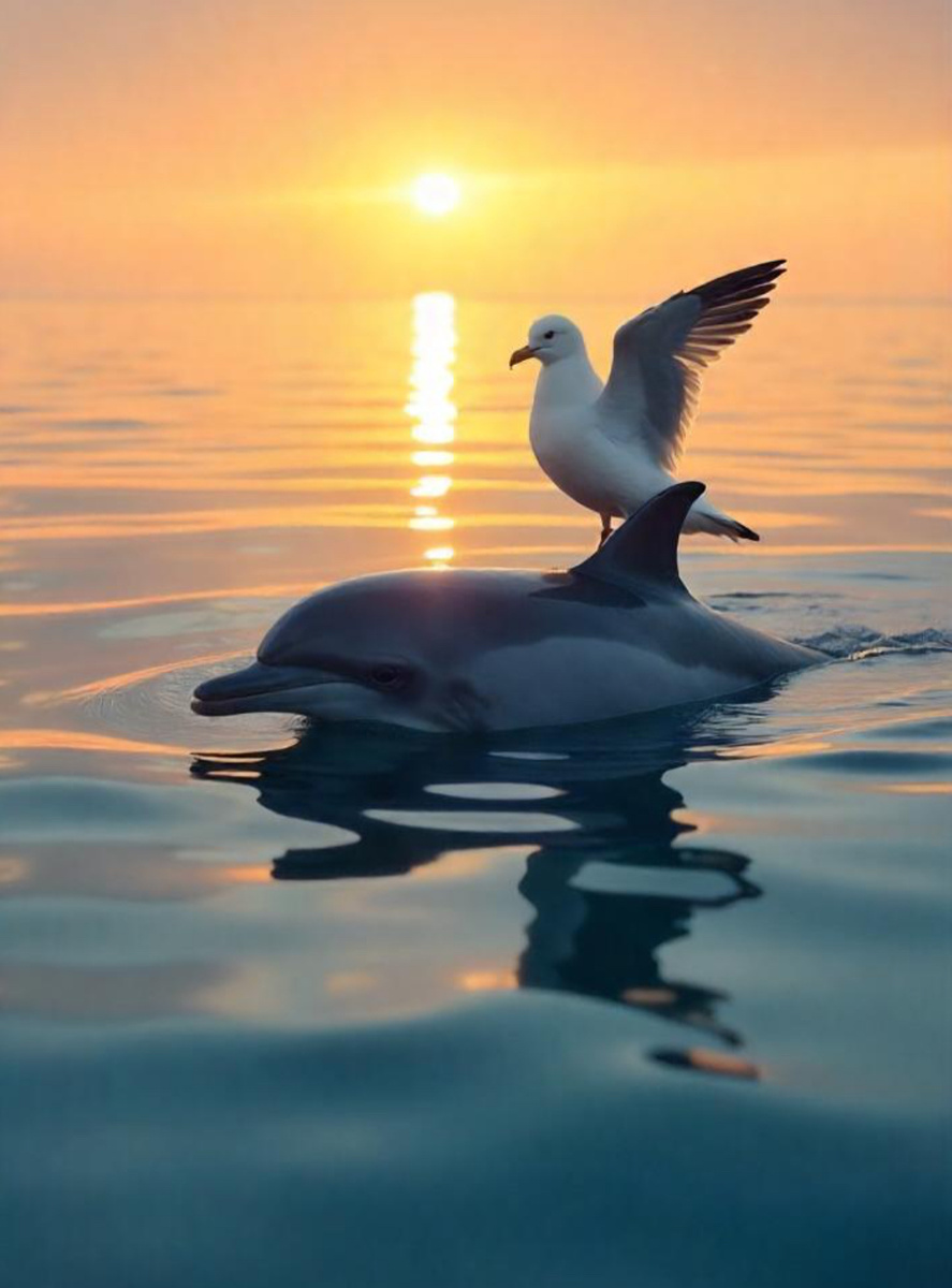 На солнечном побережье, где волны целуют золотой песок, жил весёлый дельфин по имени Бриз. Его спина переливалась серебром, а глаза светились добротой. Каждый день он резвился в лазурной воде, выпрыгивая выше облаков, чтобы поприветствовать стайку розовых фламинго. А высоко в небе, над сверкающим морем, летала белоснежная чайка Лира. Её крылья были украшены серыми узорами, а на груди алело маленькое рыжее пятнышко, будто капелька заката. Лира обожала петь песни ветру и нырять за серебристыми рыбками. Но однажды случилась беда: в погоне за добычей она запуталась в старой рыболовной сети. Крылья слиплись, клюв дрожал от страха. «Помогите!» — кричала Лира, но волны лишь шумно бились о скалы. Внезапно из глубины вынырнул Бриз. Он увидел бьющуюся чайку и, не раздумывая, перегрыз грубые верёвки. Лира вырвалась на свободу, но она дрожала от страха. «Не бойся, я с тобой», — поддержал её дельфин, подставив спину, чтобы птица отдохнула. С тех пор они стали неразлучны. Лира учила Бриза счи