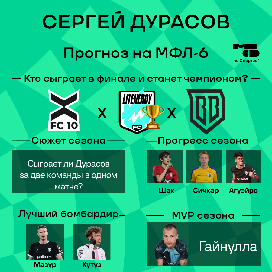 Наверное, это самый конкурентный сезон МФЛ за все время. Слишком много команд претендует на титул – «Амкал», «Броуки», 2Drots, Lit Energy. Я даже не буду удивлен высоким показателям ФК «10». Но думаю, наибольшие шансы оказаться в финале у 2Drots и Lit Energy, если они не встретятся раньше.