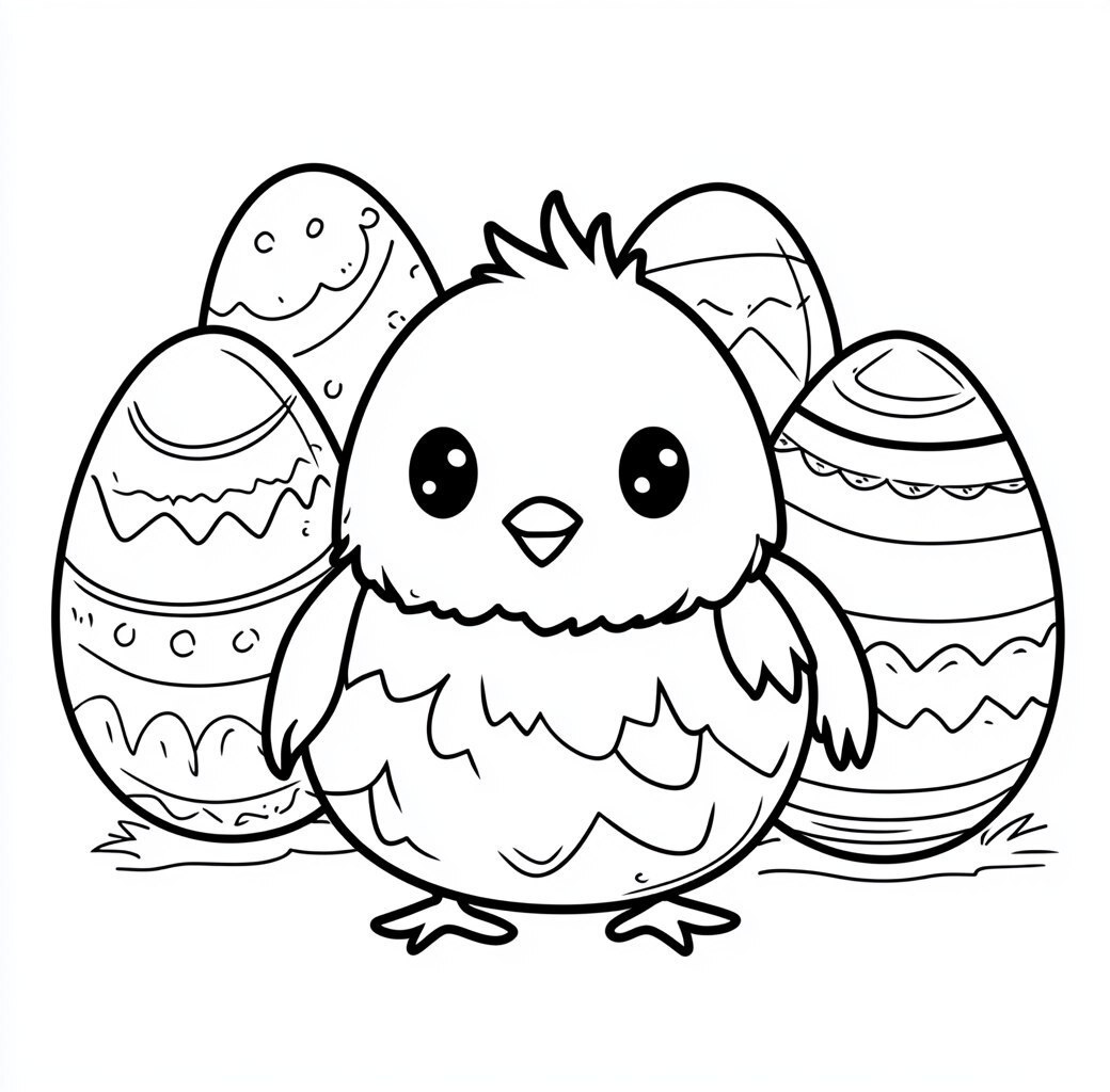 Создано на основе запроса: Cute Easter chick with an egg-shaped body, simple black and white line art coloring page for toddlers, white