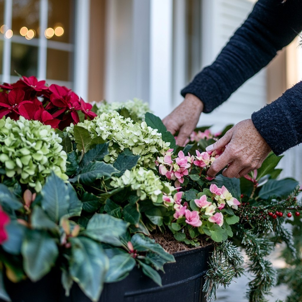 Создано на основе запроса: woman's hands planting flowers in a large oversized container, large beautiful robust winter flowers and