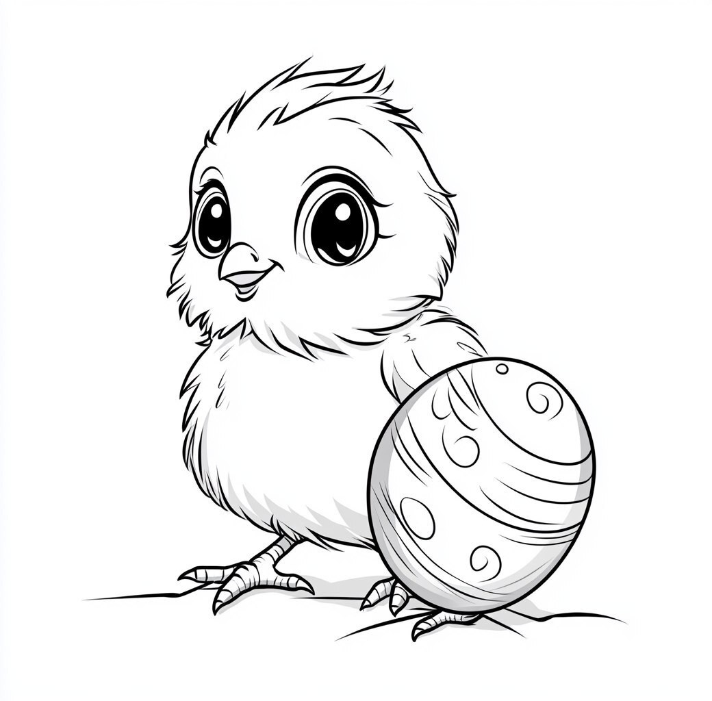 Создано на основе запроса: Coloring page for kids, a very cute baby chick with an Easter egg, in a cartoon style with thick lines