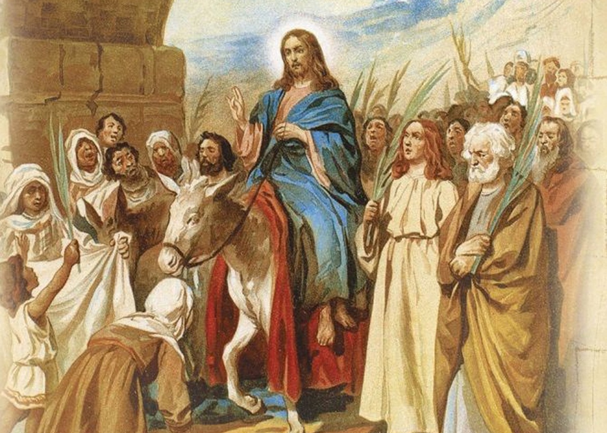И вот, прошло еще тысячу лет. В городе стоит новый храм, построенный царем Иродом. Он тоже величественен и красив, но в нем уже нет Духа Божия. А Бог словно странник, скиталец въезжает в ворота города, который станет местом его последнего человеческого упокоения. Перед тем как войти в город, Иисус отправил двух своих учеников в предместье города за вьючными животными. Многие толковники усматривают в этих двух учениках – два завета, который Бог заключил с человеком: Ветхий и Новый. То есть, Он как бы напоминает людям о том, что они обещали друг другу. Наконец, животные были доставлены. Это была старая ослица и молодой осленок. И снова святые отцы проводят аналогию. Ослица символизировала еврейский народ – старый, строптивый, неспособный на перемены. А игривый и свободолюбивый осленок – подразумевал под собою все остальное человечество, которое хоть и лишено было привилегий избранного еврейского народа, но теперь было более восприимчиво к Новой религии, принесенной Спасителем на землю.