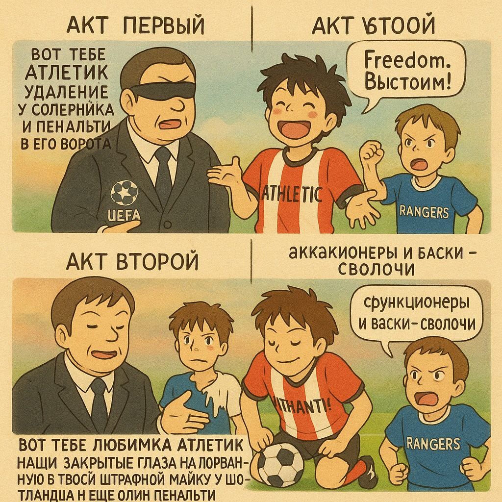 Акт первый. УЕФАмафия: Вот тебе Атлетик удаление у соперника и пенальти в его ворота Атлетик: ахахаха, лалалала, только мне все мало Рейнджерс: Freedom. Выстоим! Акт второй. УЕФАмафия: вот тебе любимка Атлетик наши закрытые глаза на порванную в твоей штрафной майку у шотландца и ещё один пенальти в ворота Рейнджерс Атлетик: ахаха, спасибо роднули, так и быть забью с пенальти Рейнджерс: функционеры и баски - сволочи