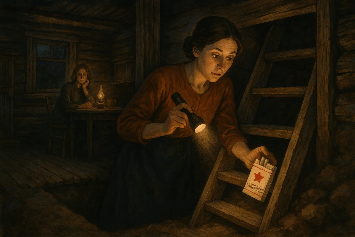 Когда моя мама была молодой, после учёбы её по распределению отправили работать в глухую деревню. Поселили их с подругой в старый деревянный дом, потемневший от времени. Дом был с норовом: то половицы скрипели без причины, то полки потрескивали, будто переговаривались, то тяжёлые вёдра с углём сами собой переползали с места на место. Мама говорила, что поначалу это пугало, но потом привыкли — деревенская жизнь, всё бывает. Однажды приключилась история, которую мама пересказывала не раз. Сидели они с подругой вечером, болтали, и вдруг захотелось курить — аж уши опухли, как мама шутила. А сигарет нет, денег кот наплакал, да и идти за ними в лавку лень, да и темно уже. Вздохнули, посмеялись, и мама, не всерьёз, говорит: «Пойду-ка в подполье, вдруг там сигаретка завалялась». Подруга хихикнула, но мама, больше для забавы, открыла люк в полу и спустилась по шаткой деревянной лестнице. В подполе было сыро, пахло землёй и старым деревом. Мама посветила фонариком и вдруг заметила на одной из с