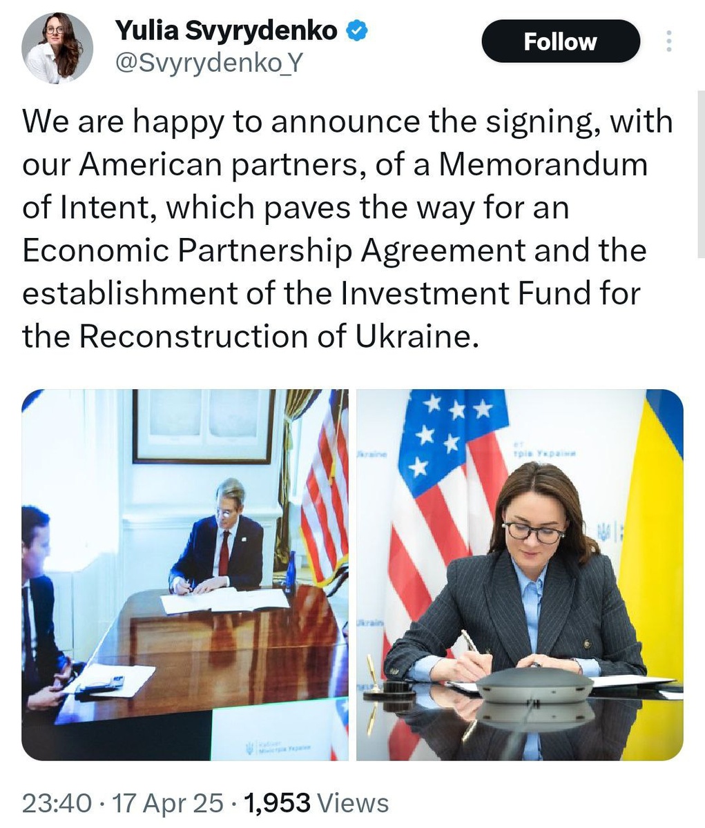 US and Ukraine sign 'Memorandum of Intent' on rare earths deal Ukraine's Economy Minister Yulia Sviridenko announces. Not the real deal, but a promise to sign the real deal. #US #Ukraine