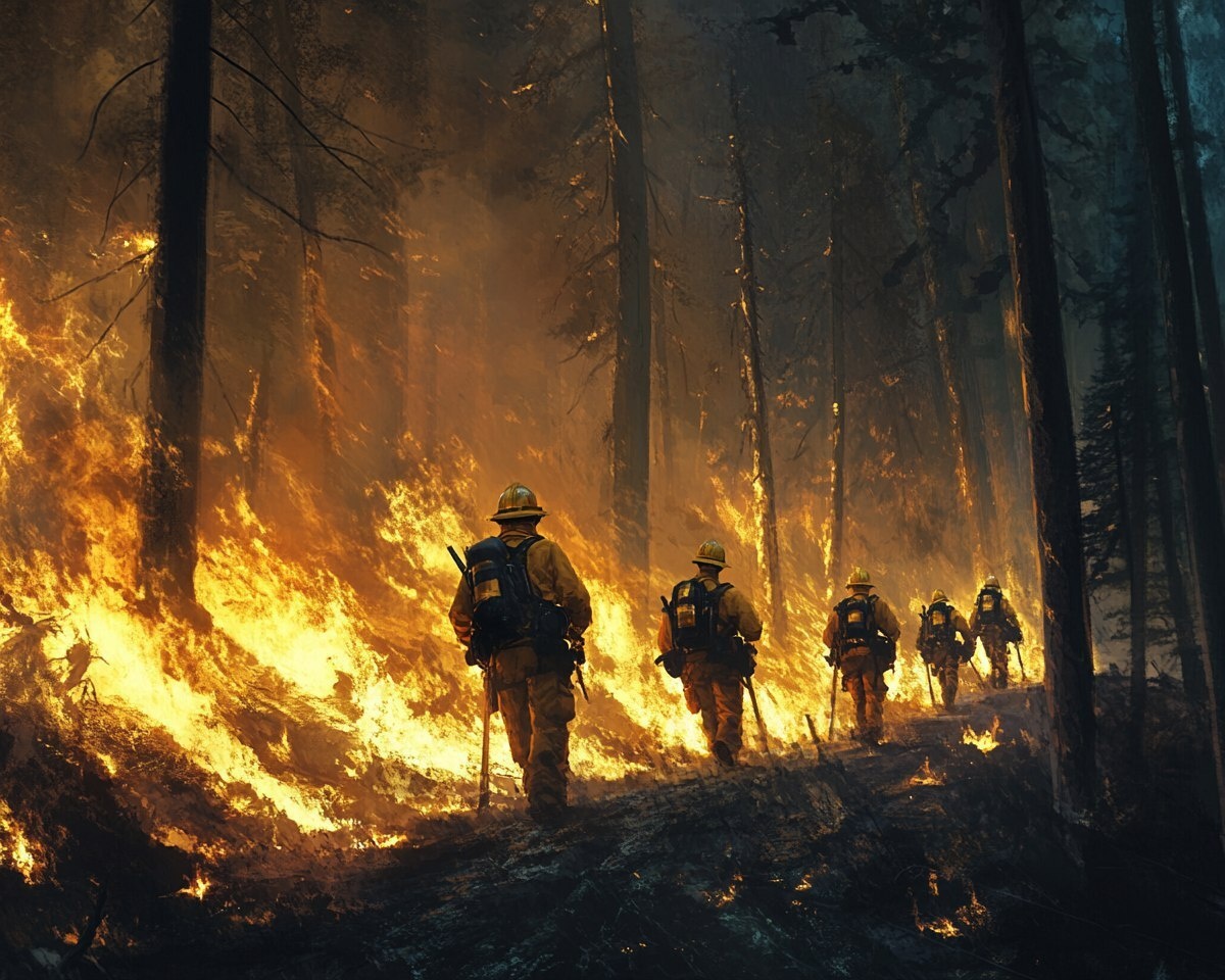 Создано на основе запроса: a wildland fire crew walking through a forest that is on fire