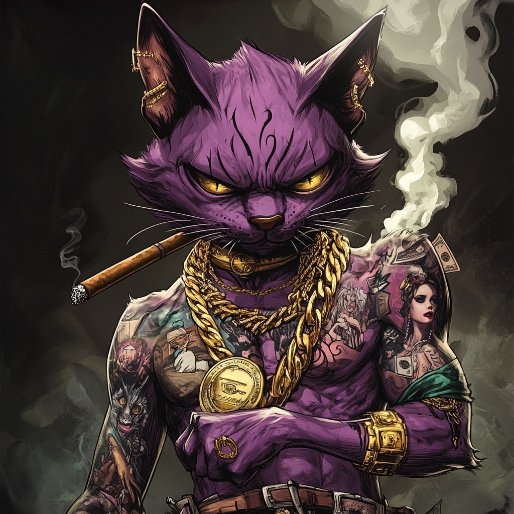 Создано на основе запроса: full body from head to feet of a skinny sleezy purple cartoon cat with gold chains around his neck and lots of money coming out of his pockets. Have him smoking a cigar and lots of tattoos of women. Make this image show his entire body. His entire body must be shown. --- Автоперевод: Полное тело от головы до ног худой из гладкого мультфильма с золотыми цепями на шее и много денег, выходящих из его карманов. Классно вышло? 🤔 https://dzen.ru/id/65c0c65c86e4f837c27b24d7 #ИИ #AI #нейросеть #midjourney #art