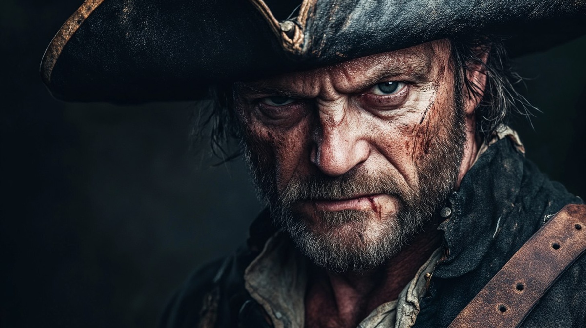 Создано на основе запроса: A hyper-realistic portrait of a grim pirate or buccaneer from the Golden Age of Piracy, aged between 40 and 50
