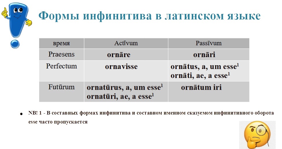В латинском языке существуют различные формы инфинитивов: Infinitīvus Praesentis Activi et Passīvi, Infinitīvus Perfecti Activi et Passīvi, Infinitīvus Futuri Activi et Passīvi. NB! Такие инфинитивы как Infinitīvus Perfecti и Infinitīvus Futuri употребляются только в инфинитивных оборотах и вне контекста не переводятся. Теперь немного о синтаксических функциях инфинитивов. Подлежащее. Infinitīvus Subjectīvus. Errare humanum est. - Ошибаться свойственно человеку. Peccare nemini licet. - Грешить не позволено никому. Дополнение. Infinitīvus Оbjectīvus. Используется с глаголами, которые требуют пояснения. Vincere scis, Hannibal, victoria uti nescis. - Побеждать, Ганнибал, ты умеешь, пользоваться победой - нет. Infinitīvus Predicatīvus. Употребляется редко, обычно вместе с esse. Vivere est cogitare. - Жить значит мыслить. (Цицерон) Infinitīvus hostoricus - описательный Brevi spatio interiecto hostes ex omnibus partibus decurrere lapides gaesa que in vallum coniicere, nostri pr