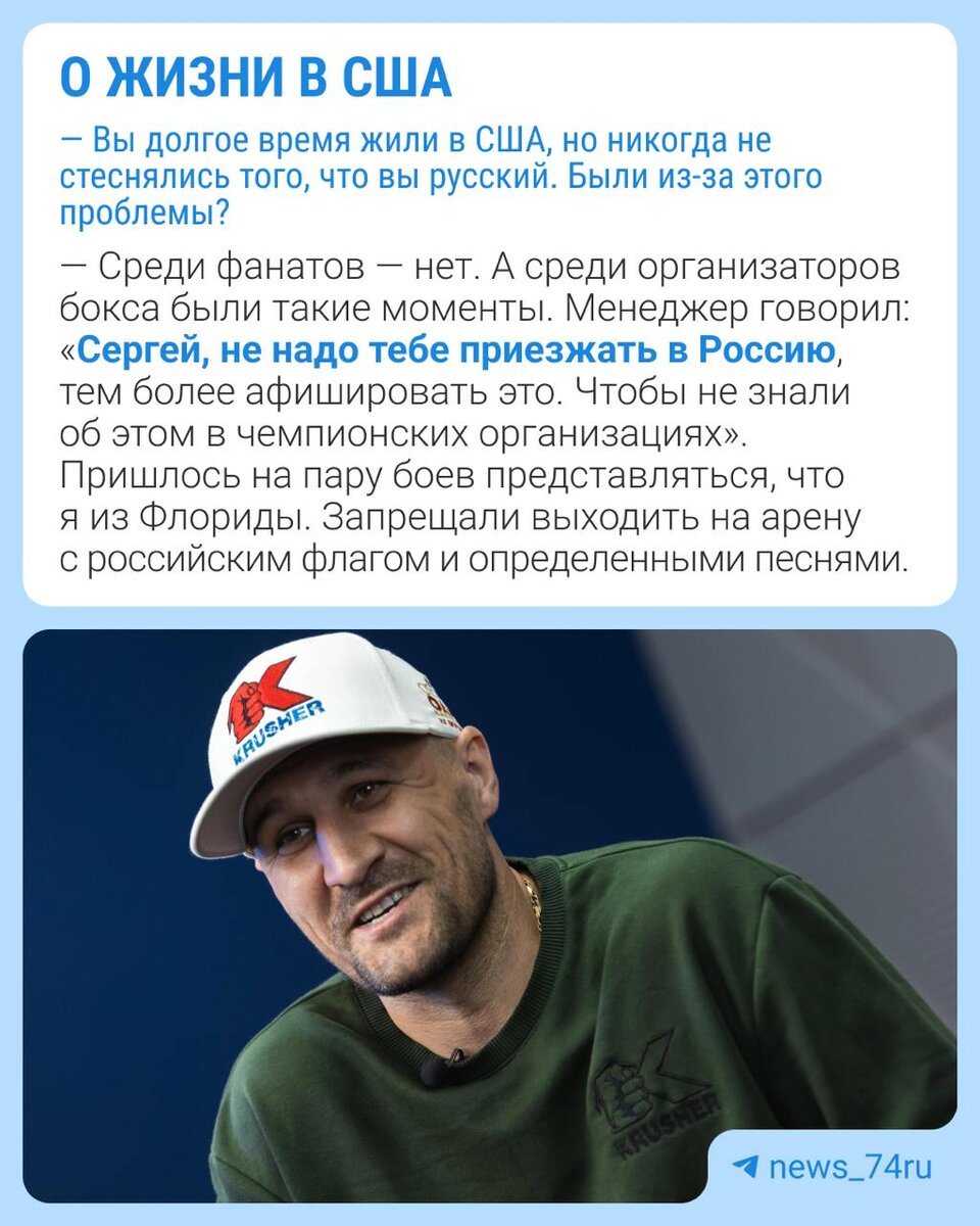В ответ на пост «Чиновникам интересно посмотреть, как кому-то намылят лицо». Сергей Ковалев — о прощальном бое, деньгах и жизни в США Сегодня вечером в Челябинске пройдет прощальный бой трехкратного чемпиона мира по боксу Сергея Ковалева. Он встретится с Артуром Манном из Германии. Поединок вызвал небывалый ажиотаж, практически все (весьма недешевые) билеты проданы. Накануне боя журналист @74.ru Виталий Гущинский поговорил с Сергеем Ковалевым, в общем-то, совсем не о боксе. О жизни в США и визитах в Россию, о хейте после начала СВО и патриотизме, о заработках и семье, о нынешнем сопернике и о том, почему элиты любят собираться у ринга на VIP-тусовку. 💬 Полное интервью с Крашером читайте на нашем сайте.