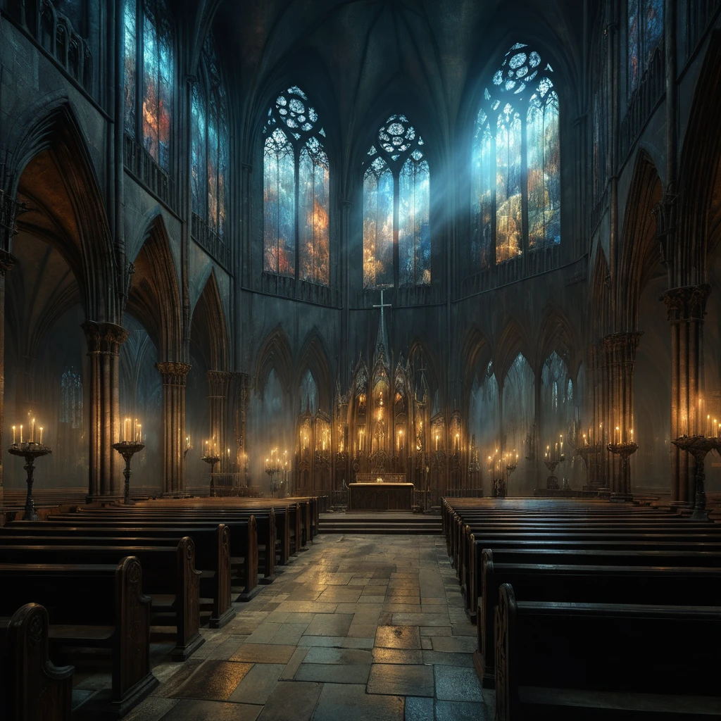 Готическое фэнтези - это мрачные замки, таинственные ритуалы, витражи с демонами и атмосфера вечной тайны. Давайте разберём, как создавать такие изображения с помощью нейросетей. Эти слова сделают ваши промты атмосферными: "Gothic cathedral interior, towering stained glass windows depicting fallen angels, candlelit rituals, eerie mist floating between pews, dark fantasy, highly detailed, 8K, art by Zdzisław Beksiński" "Abandoned medieval castle under blood moon, broken bridges over bottomless chasm, gargoyle statues coming to life, cinematic atmosphere, gothic horror aesthetic" "Secret cult ceremony in catacombs, hooded figures surrounding ancient altar with glowing runes, green mist, intricate bone carvings on walls, dark fantasy, ultra-detailed" "Vampire masquerade ball in ruined ballroom, aristocrats in elegant decayed garments, pale faces with blood-red lips, ghostly waltz, gothic romance, 19th century atmosphere" "Haunted forest with twisted black trees, faces screaming from b