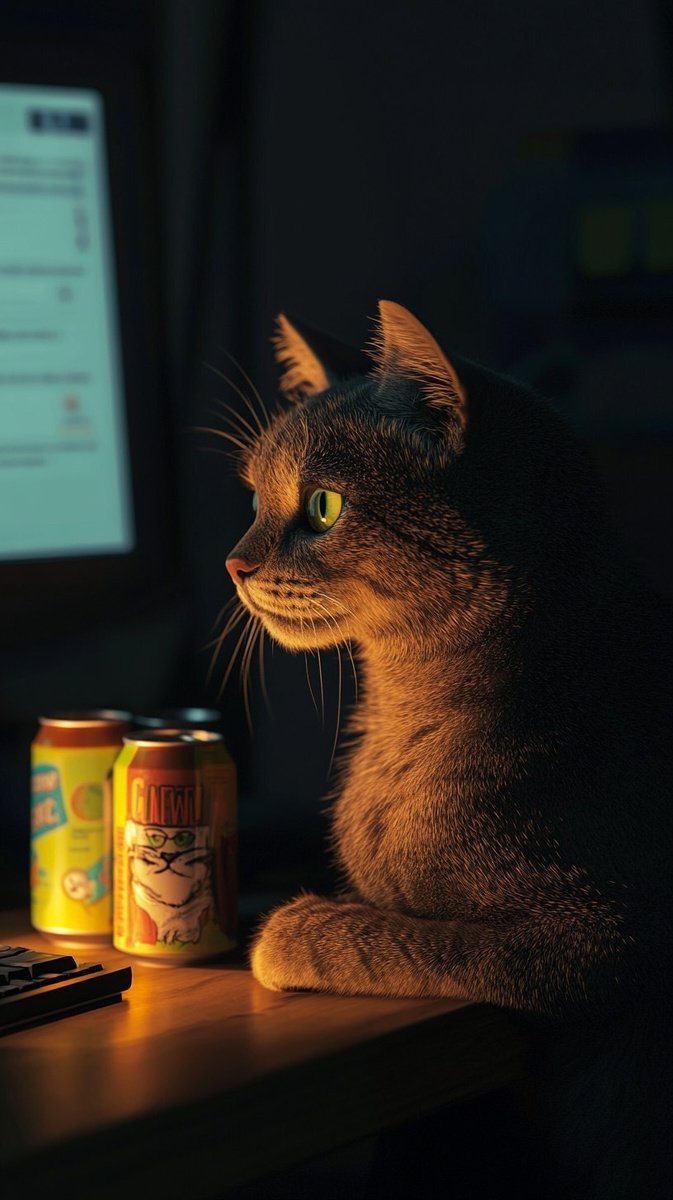 Создано на основе запроса: a realistic bipedal cat staring blankly at a screen in a dark room, face lit only by the glow of a monitor, empty energy drink cans on the desk, dark and depressive mood --- Автоперевод: Реалистичная двуноженная кошка, тупо смотревшая на экран в темной комнате, зажженном только светом монитора, пустые банки с энергетическими напитками на столе, темное и депрессивное настроение Неплохо получилось? 🤔 https://dzen.ru/id/65c0c65c86e4f837c27b24d7 #ИИ #AI #нейросеть #midjourney #art