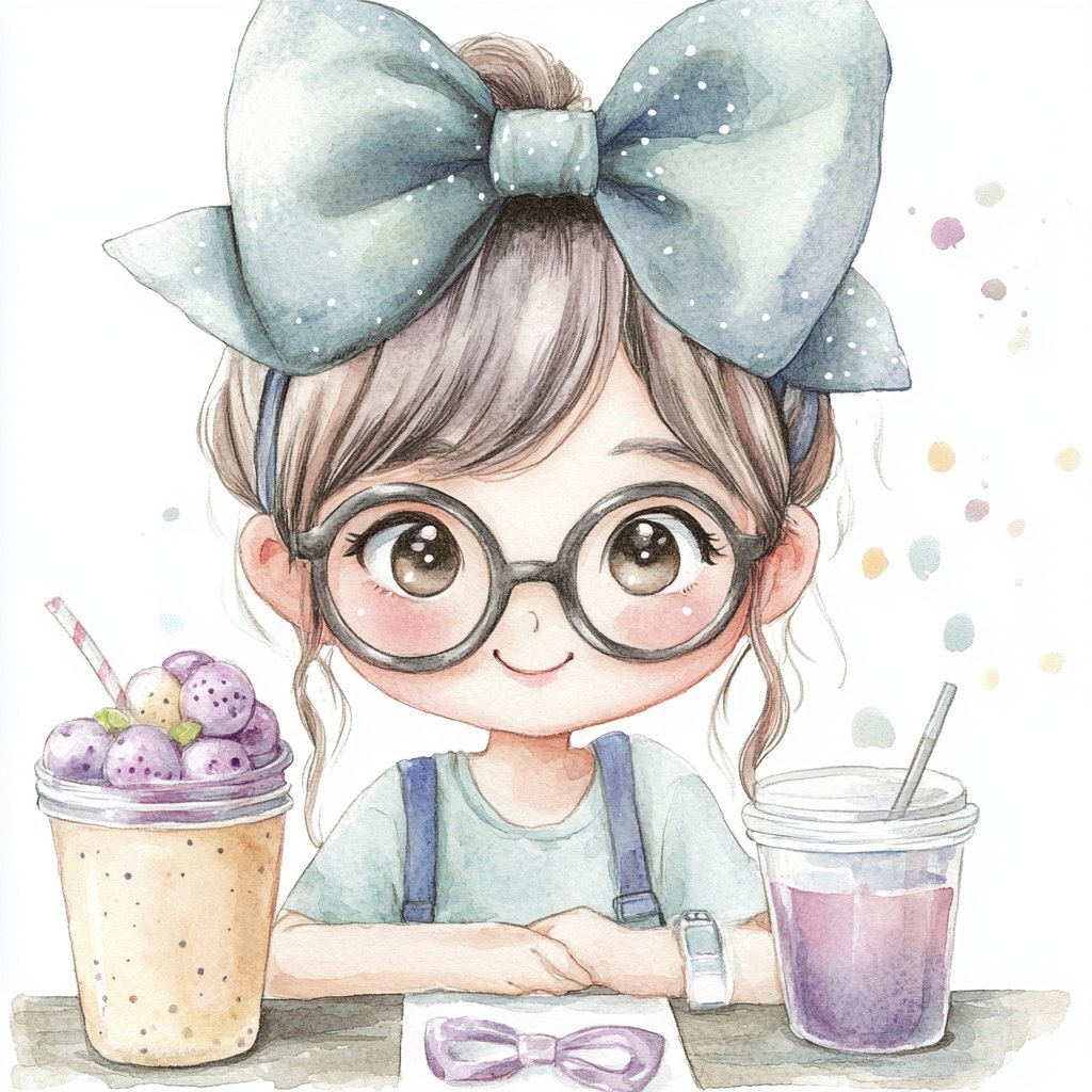Создано на основе запроса: Soft watercolor painting of a student character with a giant bow, bubble tea on the desk, and sparkly eyes full