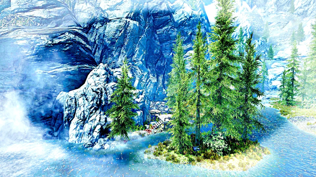 Владение Вайтран – локации. …Сразу за башнями Валтейм река Белая низвергается вниз широким водопадом; дальше её русло пролегает по ущелью, на одном из берегов которого находится пещера Глубокая Тень. Ущелье выглядит очень живописно: высокие ели по берегам, спокойная после водопада река, небольшой островок… отличное место для рыбалки и отдыха на природе! Но внешнее спокойствие обманчиво. Стоит только приблизиться ко входу в пещеру, как становится ясно, что внутри таится смертельная опасность. Люди уже побывали здесь – вероятно, их привлекли золотые жилы, одну из которых можно увидеть на утёсе за деревянными мостками. Но те, кто пришёл сюда, здесь и остались. Осматривая кровавые следы у входа в пещеру, Довакин обнаружит несколько тел золотоискателей. Кто-то жестоко расправился с ними. Внутри пещеры всё ещё хуже. Весь тоннель усыпан человеческими костями и черепами – остатками чьего-то кровавого пиршества. В первом большом гроте золотоискатели устроили большой лагерь – они явно собиралис