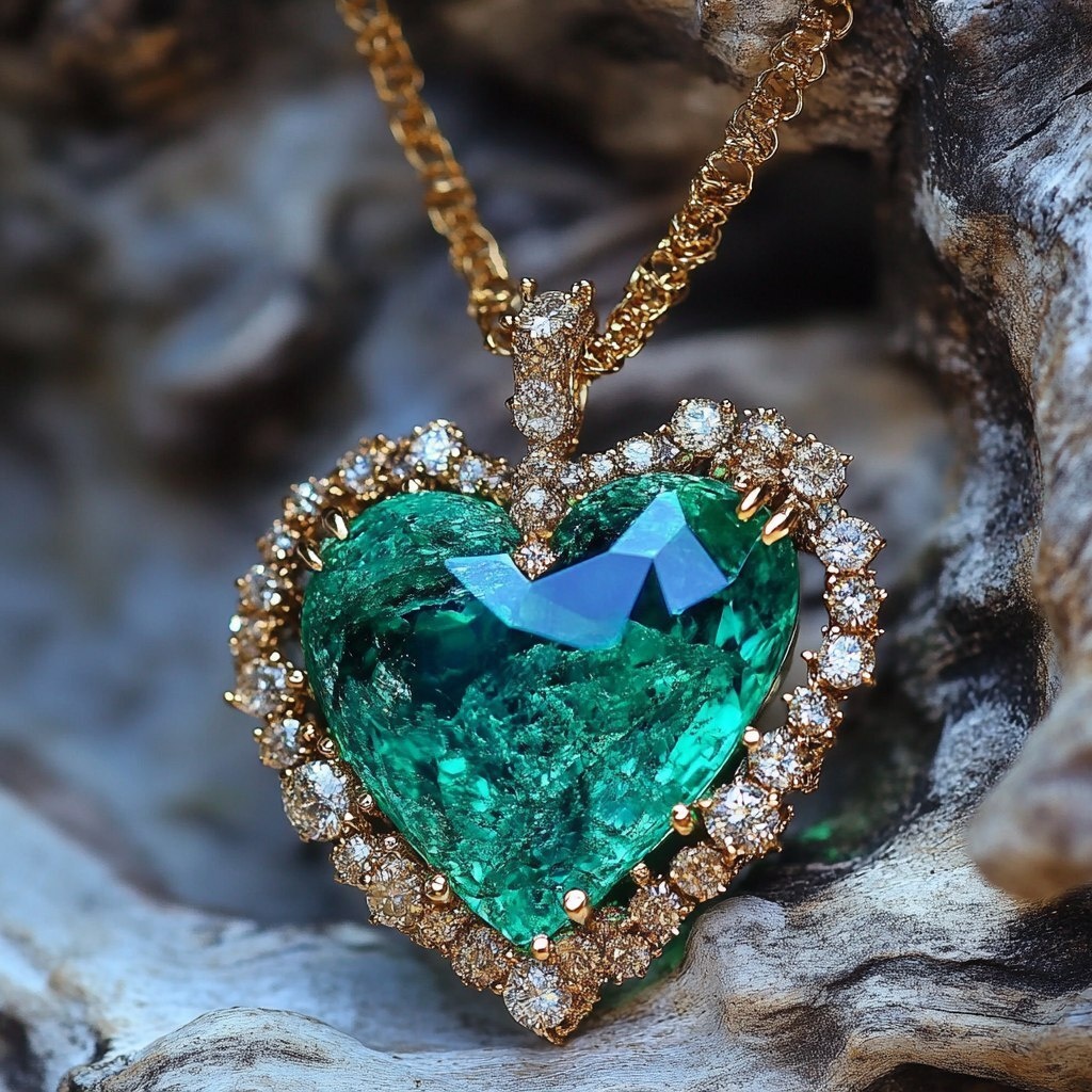 Создано на основе запроса: colar de esmeralda grande formato coração com brilhantes contornando a pedra