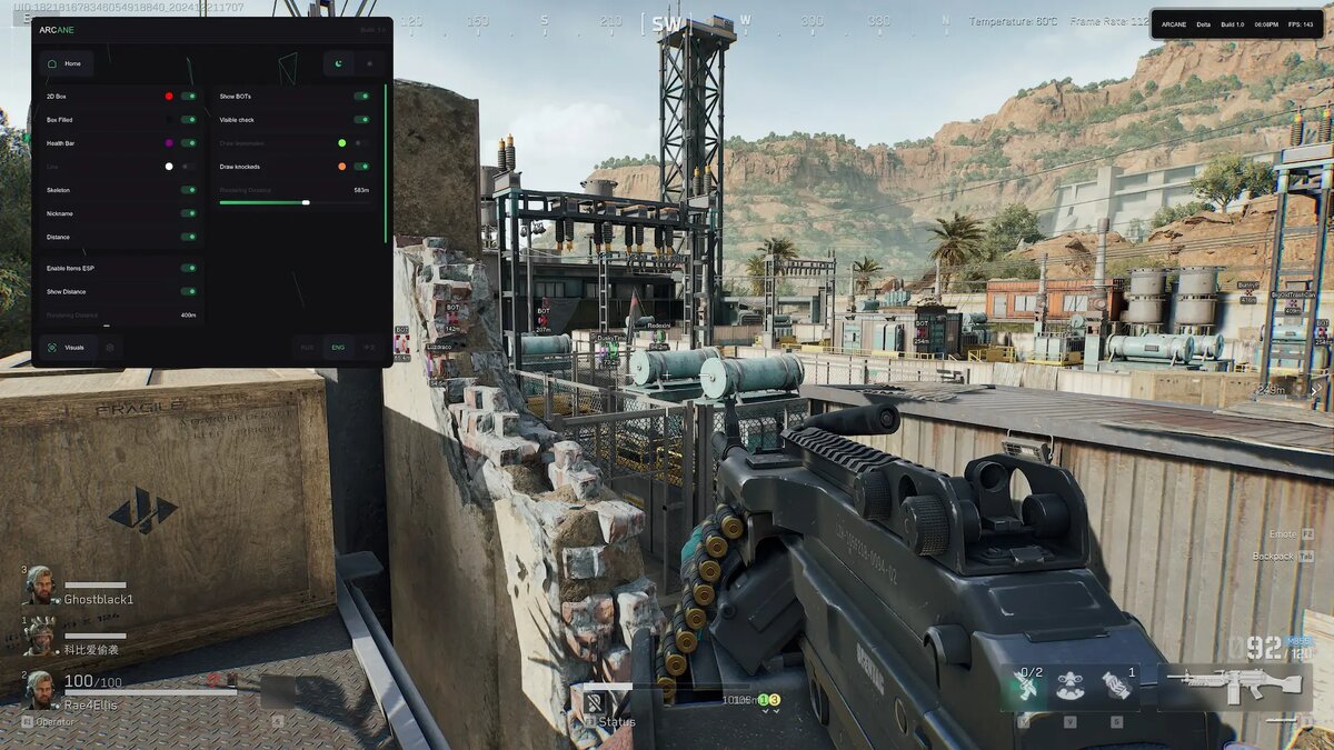 Визуалы: Box ESP и Skeleton ESP с цветами для видимых и невидимых врагов. Максимальная дистанция — 300 метров. Простенько, но эффективно: на Operations я видел кемперов через стены и заранее готовился к бою.