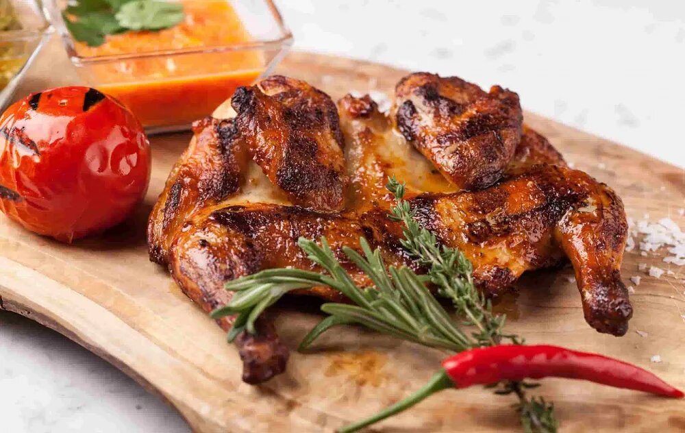 Цыплёнок табака обычно подаётся с различными гарнирами, такими как свежие овощи, зелень, картофель или рис. Это блюдо отличается насыщенным вкусом и ароматом благодаря использованию специй и чеснока.