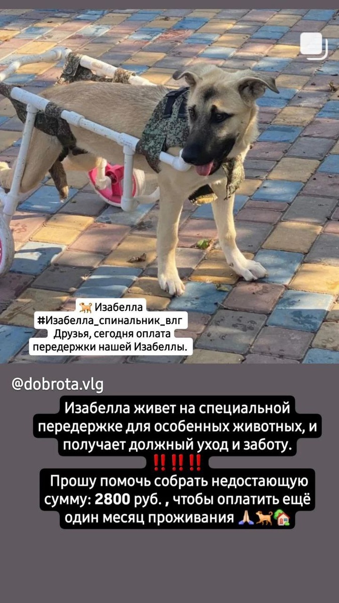 Друзья, сегодня оплата передержки нашей Изабеллы. Когда она была щенком, её покалечили жестокие люди, и собака осталась на всю жизнь инвалидом. Третий год Изабелла живет на специальной передержке для особенных животных, и получает должный уход и заботу.