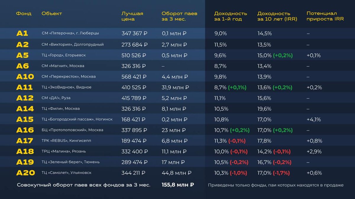 Вторичный оборот паев фондов на 18.04.2025 г. ➡️ Актуальные цены вы найдете в личном кабинете, раздел «В продаже». 🔸 Доходность зависит от цены пая конкретного предложения 🔸 Количество доступных паев ограничено Как происходит расчет показателей, объяснили здесь. — * Настоящее предложение не является публичной офертой #best