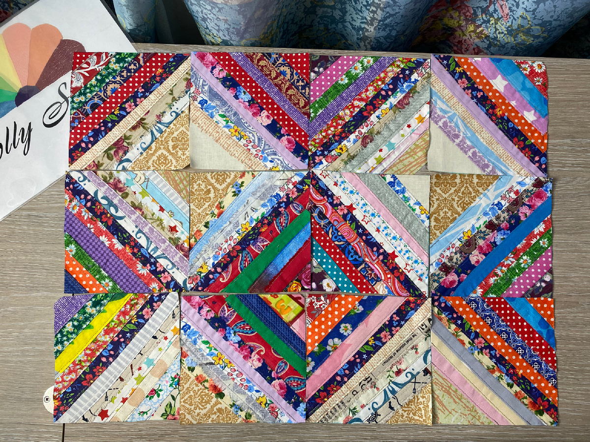 Вот сейчас кто-то скажет: "Ну всё, дошла до края, как будто шить уже не из чего! Кромки-то ведь можно и выкинуть". Но вы посмотрите , какие они красивые! Почему обрезают кромки? Края ткани более плотные, жесткие. В готовом изделии они будут топорщится и стягивать полотно. А лоскутницы-рукодельницы очень любят с ними работать. Ведь можно сшить красивую вещь, которую не надо стирать. Это может быть красивое панно на стену, сумка, косметичка, декоративная подушка, даже верхняя одежда! Способов работы, создания узора, может быть несколько. Вот один из них. Все кромки рассортируем по цветам, на «светлое/темное». Подготовим основу из вспомогательного материала. У меня это квадраты 15 на 15 см. Вырезала их из самого дешёвого, недорогого клеевого флизелина. На каждом квадрате обозначим вспомогательные линии. Нарисуем диагонали, а дальше уже начинаем работу. На сторону с клеем нашиваем кромки, закрываем уголок кусочком ткани, а потом сверху пришиваем кромку. Один край кромки плотный, обра