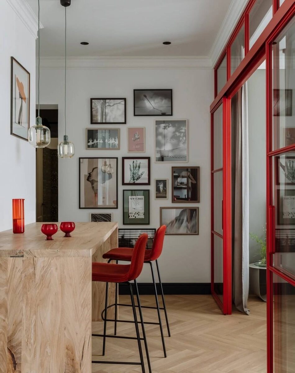 Шикарный интерьер для семьи. Сине-зелёная гамма и яркие красные акценты пронизывают весь интерьер, объединяя комнаты в единое гармоничное пространство. Декор, произведения искусства и мебель тщательно подобраны для этой семьи, ведь здесь ничто не случайно, даже расположение картин создаёт ощущение завершённости и продуманности. Площадь: 102 кв. м. Дизайн: VICTORIA VLASOVA