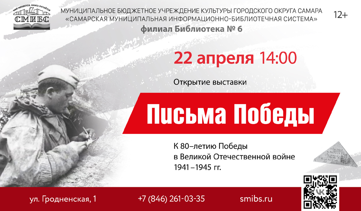 22 апреля в филиале Библиотека № 6 МБУК г.о. Самара «СМИБС» состоится открытие выставки «Письма Победы» – третьей части документального проекта «К Победе – вместе!», посвящённого 80-летию Победы в Великой Отечественной войне 1941-1945 гг. Начало мероприятия – 14.00 Выставка включает 5 основных разделов, вмещающих историю жизни страны и судьбы её людей в годы Великой Отечественной войны. История отражена через фронтовые письма наших земляков. Письма воссоздают ушедшие события военного четырёхлетия, жизнь представителей нескольких поколений участников сражений. Примером такой переписки являются письма родным и близким фронтовиков, призванных из Куйбышева, которые сегодня хранятся в семейных архивах как бесценные реликвии. Малая часть из них представлена на выставке «Письма Победы». На треугольных конвертах указаны адресаты и место назначения. Однако есть среди представленных и письма солдат без указания имени. Одно из таких писем родственники долгое время хранили как дорогую память в мед