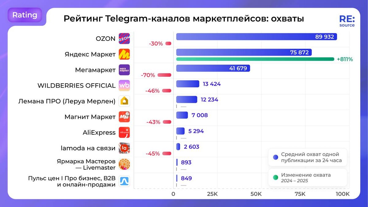 🔹🔹🔹 Канал Яндекс Маркета за год вырос сильнее других каналов маркетплейсов По охвату — на 811%, а по репостам — на 25 000%! При этом в первом рейтинге канал Яндекс Маркета уступает каналу OZON, а во втором — Мегамаркету и lamoda на связи. Рейтинги Telegram-каналов из других сфер: 🧑🎓Университеты 💉Косметологические клиники 🦷Стоматологические клиники Источник: TGStat #TGrating Подписаться на RE:source