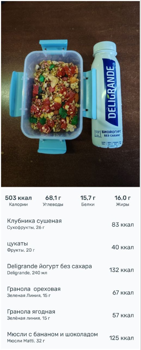 😏 Сушеная клубника? 🗓 18.04.25 09:00 💪 День похудения: 100 ⬆️Список продуктов и КБЖУ на фото. Сегодня в мюсли кинул цукаты и сушеную клубнику. Было вкусно, но слишком сладко. #завтрак 😎 Roman Legas | Life