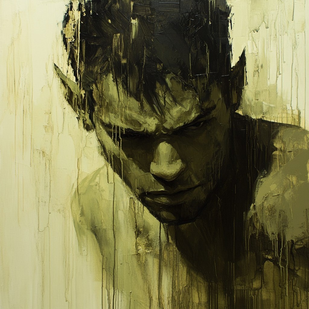 Создано на основе запроса: abstract painting brushstrokes by Jeremy Mann of a young orc man
