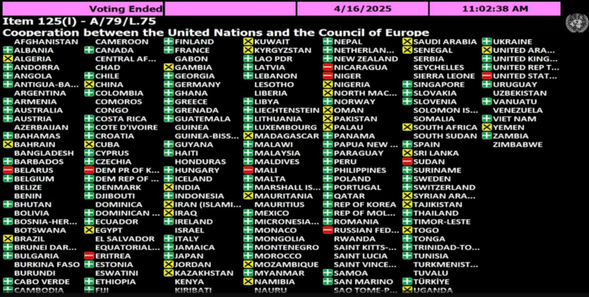 В армянском обществе разгорелась дискуссия: являются ли армяне братским народом для России? Докладываю соображения. 16 апреля 2025 года Генеральная Ассамблея ООН большинством голосов приняла никому не нужную и не обязательную к исполнению резолюцию со сложным названием "Сотрудничество между Организацией Объединенных Наций и региональными и другими организациями: сотрудничество между Организацией Объединенных Наций и Советом Европы". В документе содержится несколько недопустимых для России формулировок об агрессии, создании международного трибунала и т.д. и т.п. Вот заключительная фраза одного из наших представителей в ООН А.И. Марденской перед голосованием за резолюцию: - Рассматриваем данный проект как глубоко ущербный. Поэтому мы поставили его на голосование и призываем всех, кому небезразлична репутация ООН, голосовать против его принятия. Благодарю за внимание. Помните, как из-за поребрика кричали, что за Россию голосует только Мали, Сомали и КНДР. Таки да. Мали и КНДР опять про