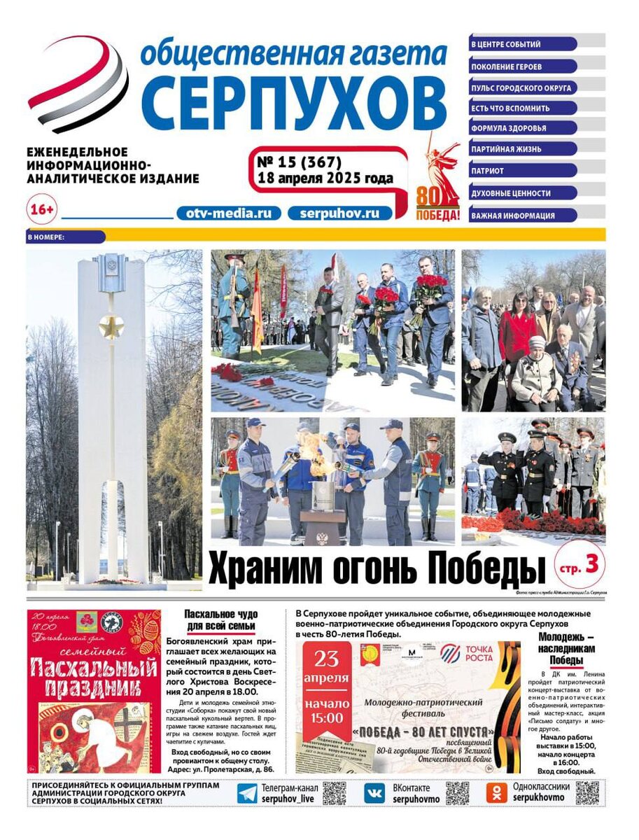 🗞️ О самых интересных событиях Серпуховского региона читайте в новом номере «Общественной газеты – Серпухов»: ______________________________________________ ✔️По поручению губернатора Андрея Воробьева в Подмосковье стартовал ремонт дорожного полотна на региональных, муниципальных и федеральных дорогах. ✔️Храним огонь Победы! В Пущино зажгли Вечный огонь на Мемориале Великой Отечественной войны. Репортаж с этого важного события в нашей газете. ✔️Труд во славу Серпухова. Расскажем, как муниципалитет отметил День труда московской области. ✔️У войны не женское лицо? Читайте в нашем эксклюзивном материале о 1-м отдельном женском запасном стрелковом полке, который базировался в Серпухове в годы Великой Отечественной войны. ✔️Серпухов готовится встретить светлый праздник Воскресения Христова. Публикуем расписание служб в храмах округа. ✔️Серпуховский военно-спортивный центр «Маргеловец» отметил 12–летие. Репортаж торжественного мероприятия, а также другие события из жизни молодежи окру