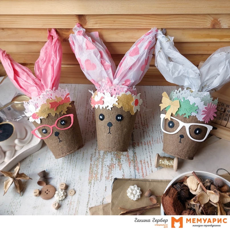 Всем привет! С вами Галя и фото подробности вчерашнего мастеркласса по необычной упаковке к Пасхе. Напомню, в такой упаковке можно спрятать сладости или крашенное яйцо. Вот сам МК. Сегодня мы любуемся результатом. Невероятно милые на загляденье зайки у меня получились! Вместо глазок я использовала вырубку-пуговки из набора от Мимикат «Ласточкино гнездо», а носики сделала из ягодок черники (здесь помог сет «Сплету венок»). "Розовые очки" так идут нашей зайке. У каждого зайчонка обязательно должен быть милый хвостик! Цветочек из "Привет, ромашки" идеально его, т.е. хвостик, имитирует. Идею с прическами из кустов я повторила. Помните моих единорожек из «Баночки про запас»? Здесь использовала сеты: "В тот единственный сад", "Привет, ромашки", "Летучий пленник, запертый в стекле", "Вершки и корешки", "Светлой Пасхи". Чтобы смягчить, добавить работам лёгкости, воздушности, я использовала бумажное кружево - вырубку ножом «Возвращение Ришелье» из кальки и цветного кардстока. Ушек я сделала из
