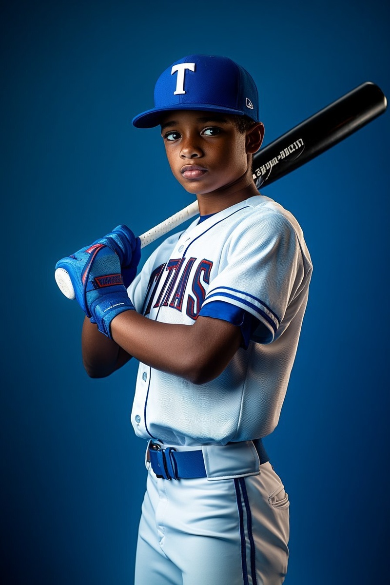 Создано на основе запроса: A striking ultra-realistic portrait of a 14-year-old baseball player in a powerful stance. He wears a pristine white and blue Titans uniform, ‘TITANS’ across the chest, white pants with blue piping, and a blue belt. His blue batting gloves grip a black baseball bat, which is pointed directly at the camera in a bold, engaging pose. His confident expression is framed by his blue baseball cap with a red ‘TB’ emblem. Dramatic studio lighting with a rich, deep blue gradient background enhances the intensity of the shot. Captured on a Sony A7R IV with an 85mm lens at F1.2 aperture, ultra-HD 8K resolution, cinematic depth of field, and professional sports photography quality