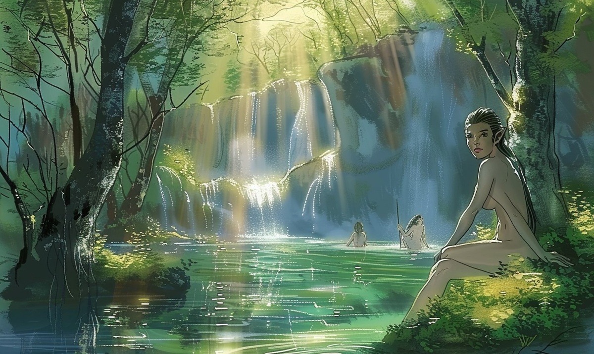 Создано на основе запроса: dnd, MTG style fantasy art, forest glade, lake pool, waterfall, trees, sunlight through the trees, painterly