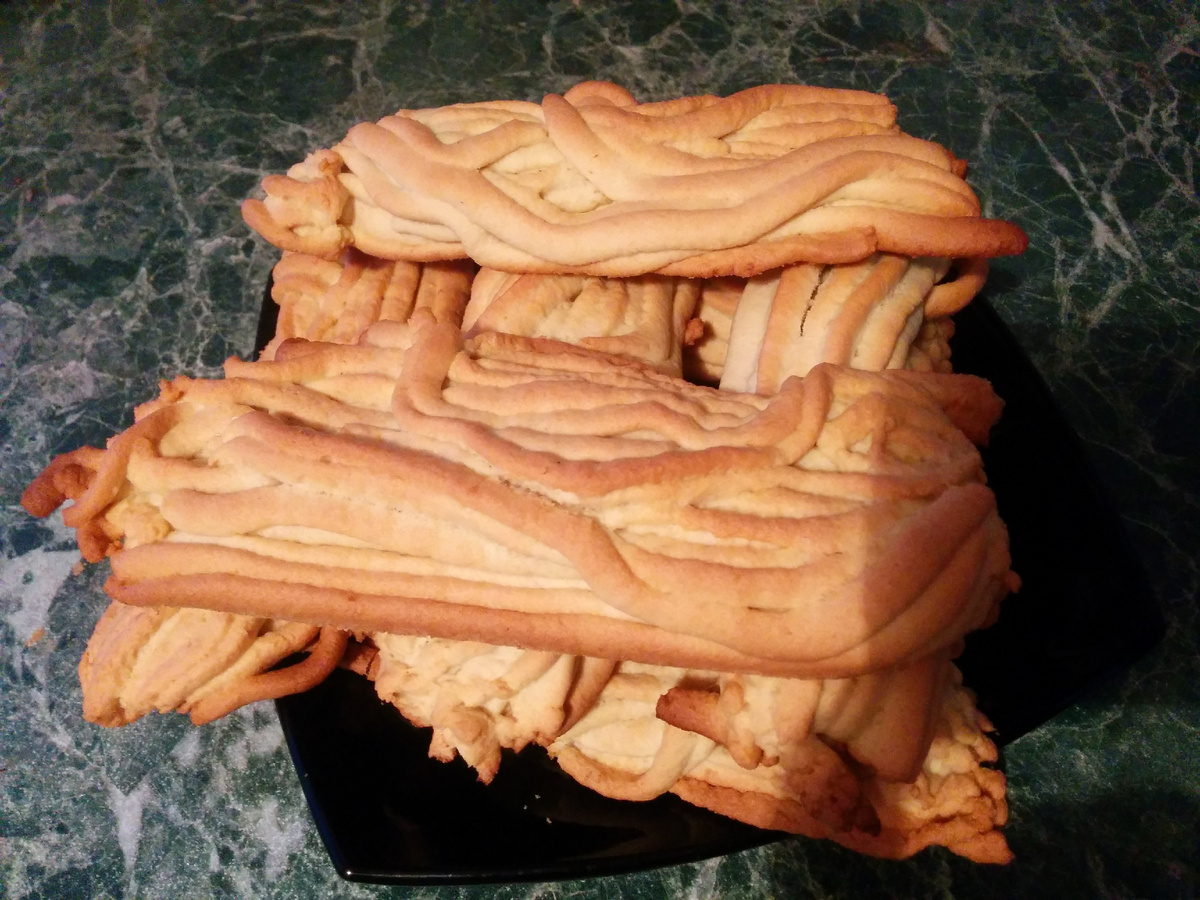 Ингредиенты: - Яйца — 3 шт. - Сахар — 300 г. - Масло сливочное — 400 г. (растопленное) - Сметана — 200 г. - Сода — 12 г. - Соль — 8 г. - Мука — 1120 г. Приготовление: - В небольшой кастрюле растопите сливочное масло. Дайте ему немного остыть. - В глубокой миске взбейте яйца с сахаром до получения однородной массы. Затем добавьте растопленное масло и сметану, тщательно перемешивая. - В отдельной миске смешайте соду, соль и муку. Постепенно добавляйте мучную смесь в яичную массу, замешивая тесто. Оно должно получиться мягким и эластичным. - Заверните готовое тесто в пленку или положите в контейнер и поместите в морозильник на 1-2 часа, чтобы оно хорошо охладилось и стало более плотным. - После того как тесто замерзнет, достаньте его из морозильника и прокрутите через мясорубку. Это придаст печенью интересную текстуру. - Разделите получившуюся массу на небольшие порции и сформируйте из них печенье. - Застелите противень пергаментной бумагой. Выложите на него сформированные печенья, оставл