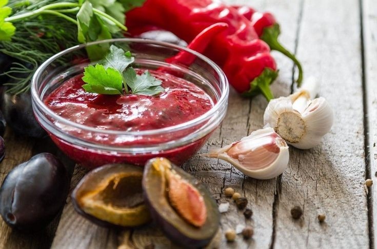 Это традиционный грузинский соус на основе кислой сливы (алычи). Он имеет кисло-сладкий вкус с нотками специй и трав. Ткемали прекрасно сочетается с мясом и тестом хинкали, добавляя яркость и свежесть.