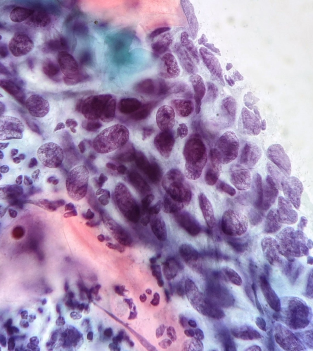 Традиционный цервикальный препарат, окрашенный по Папаниколау, от пациентки с HSIL.