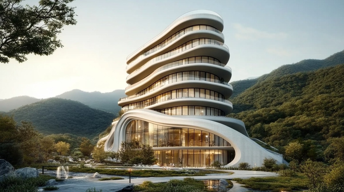 Создано на основе запроса: A 10-story condominium tower with flowing, organic architecture and curvilinear design, featuring community facilities on the first 3 floors. Smooth concrete and glass facade, fluid lines, biomorphic form, inspired by nature. Frontal view, eye-level perspective. Located in Ulsan Alps Resort, South Korea, surrounded by mountains and forest. Eco-friendly, futuristic, harmonious with landscape, soft daylight --- Автоперевод: 10-этажная башня кондоминиума с плавной, органической архитектурой и криволинейным дизайном с общественными объектами на первых 3 этажах. Как тебе изображение? 🤔 https://dzen.ru/id/65c0c65c86e4f837c27b24d7 #ИИ #AI #нейросеть #midjourney #art