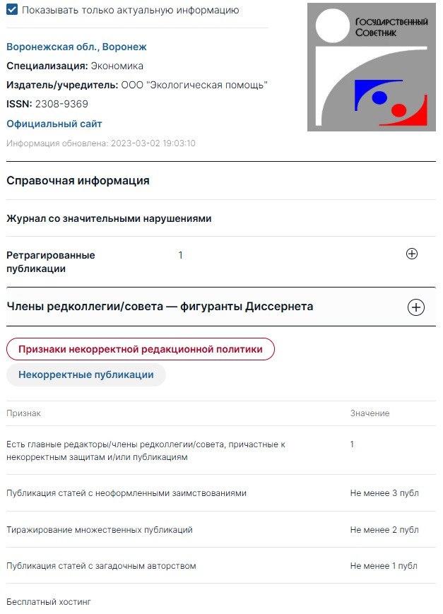 Economic Consultant [Государственный советник] Специализация: Экономика Издатель/учредитель: ООО "Экологическая помощь"Журнал со значительными нарушениями https://www.dissernet.org/magazine/research_journal_of_pharmaceutical_biological_and_chemical_sciences