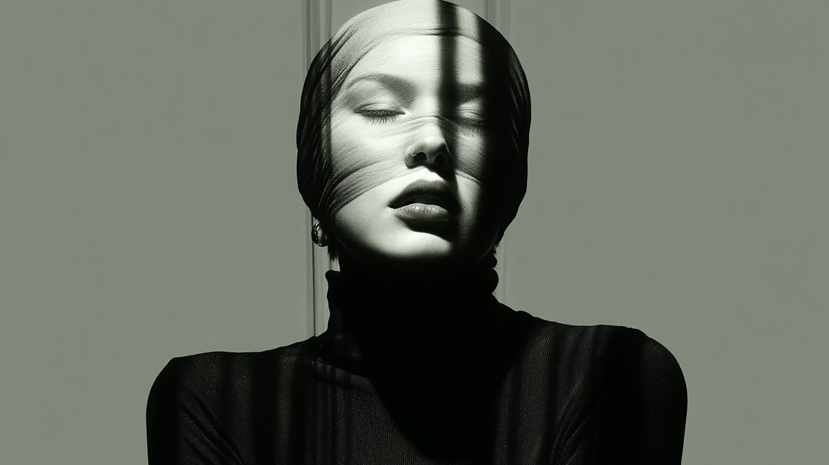 Создано на основе запроса: A dark surrealist black and white portrait of a woman trapped within her mind, photography, photorealistic, extreme detail, hyper realistic, volumetric lighting , dynamic lighting and shadows, color gradient, medium format film photography, rule of thirds,