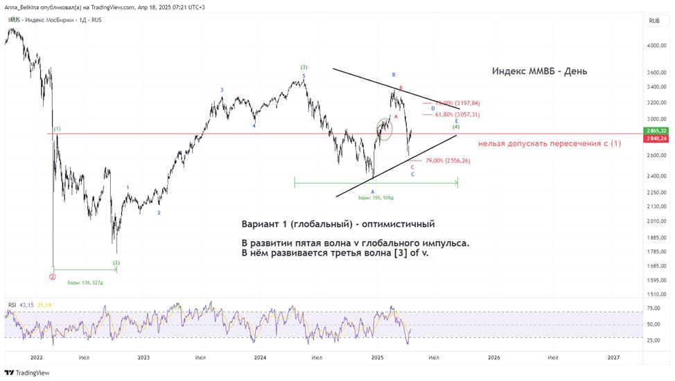 #IRUS Индекс ММВБ развернулся в волну D of (4) локального треугольника. Цели роста – диапазон 61.8% - 79%. По гипотезе с формирующимся импульсом важно завершить треугольник выше красной линии (уровень 2840) для недопущения пересечения с волной (1). Вариант с бегущей плоскостью в волне (4) – не треугольника – также в силе. Если рост идет в виде КД, то ограничения по непересечениям нет. В целом, по-прежнему по российскому рынку рисуется продолжение коррекции либо в виде треугольника/плоскости с дальнейшим выходом наверх. Не является ИИР
