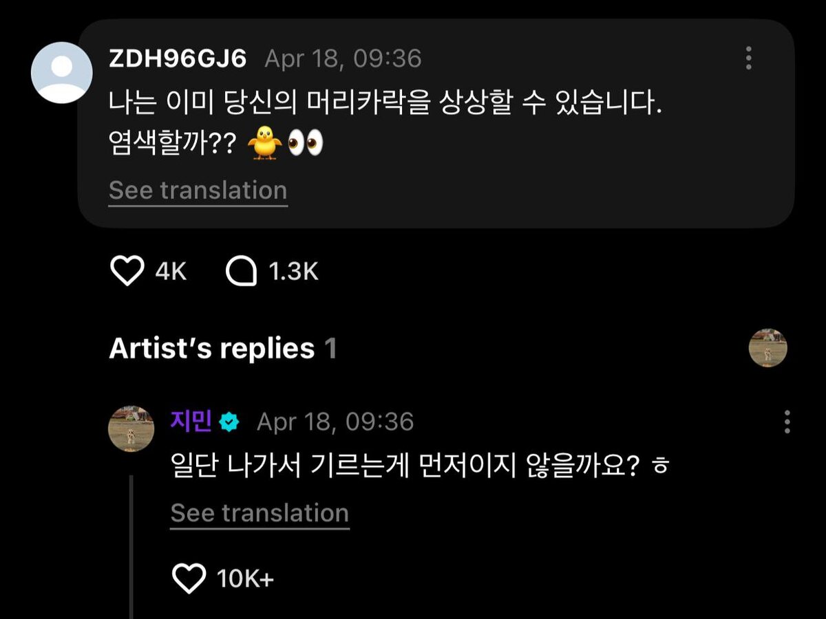 🍀 Чимин на Weverse: Арми: Я уже могу представить твои волосы. Может, покрасишь? 🐥👀 Чимин: Сначала, наверное, стоит выйти и отрастить их, да? ㅎ #JIMIN 🦖🌱[https://dzen.ru/id/5f3ce54ccaeef80d2efd6e05]🌱🦖