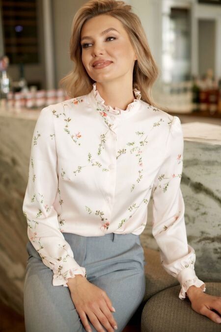 - Блузка с едва заметными цветами отлично сочетается с джинсами или юбкой-карандашом.